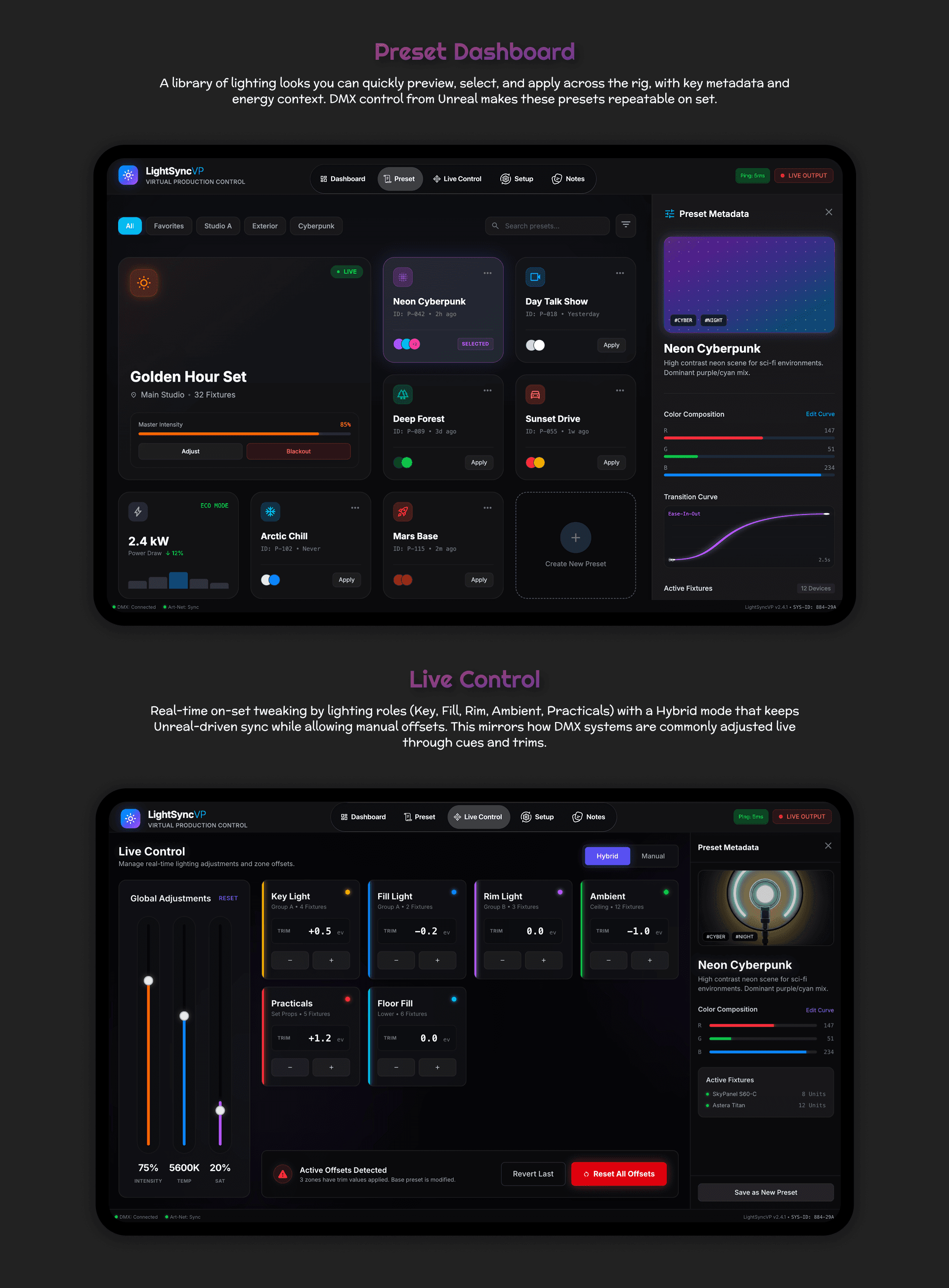 Virtual production system that synchronizes physical lighting with virtual environments in real time, enabling immersive green/blue-screen shoots with natural, responsive visuals.